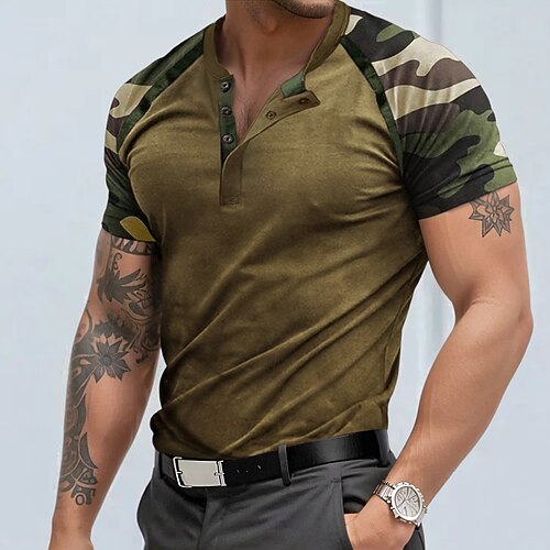 Per uomo Camicia Henley T-shirt Color Block Camouflage Henley Esterno Informale Manica corta Pulsante Abbigliamento Di tendenza Originale Comodo