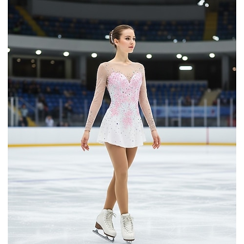 Abito da pattinaggio artistico Per donna Ragazze Pattinaggio sul ghiaccio Vestito Bianco Patchwork Orlo asimmetrico Rete Alta elasticità Allenamento Competizione Vestiti da pattinaggio sul ghiaccio