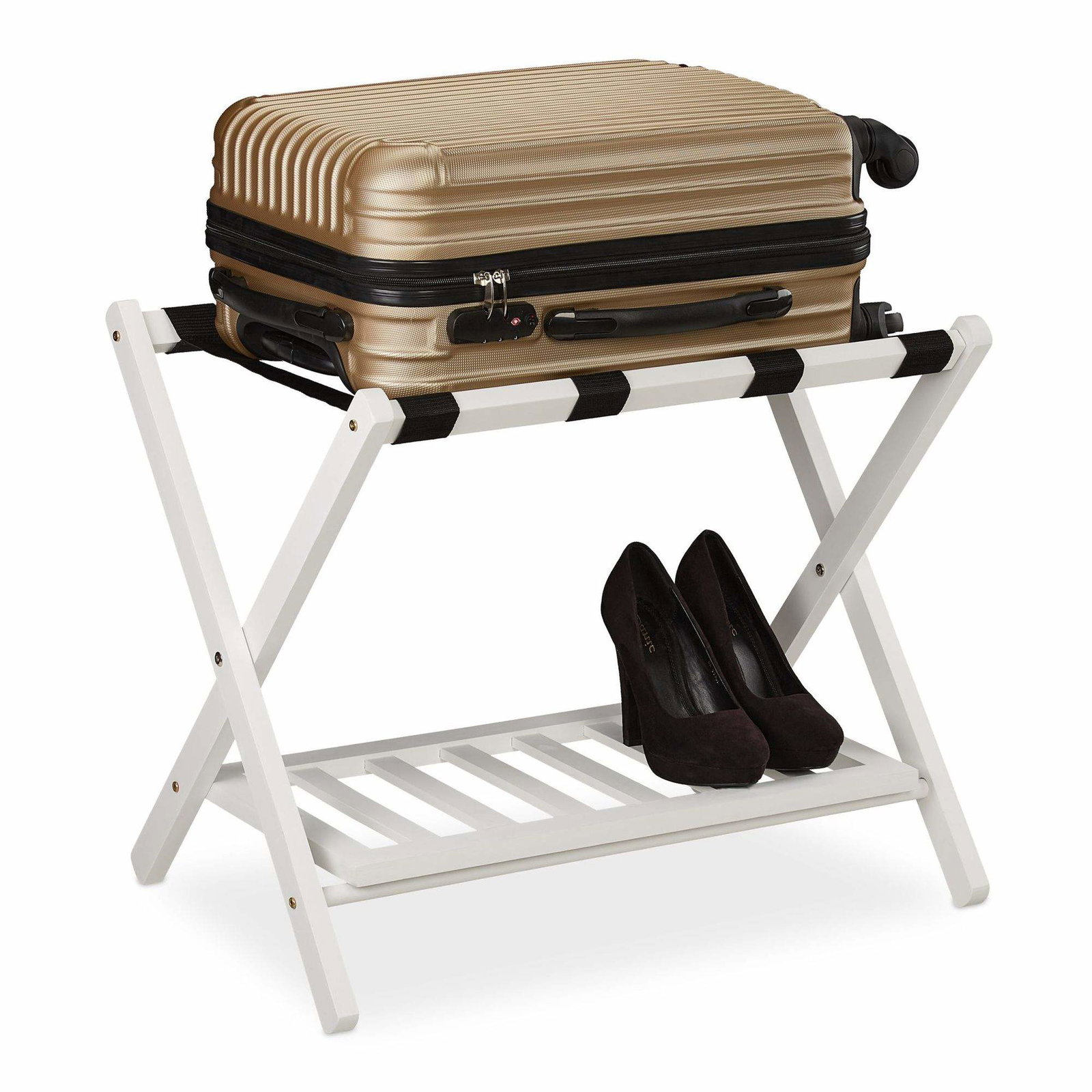Sammenleggbar bagasjehylle i tre med 2 stativer