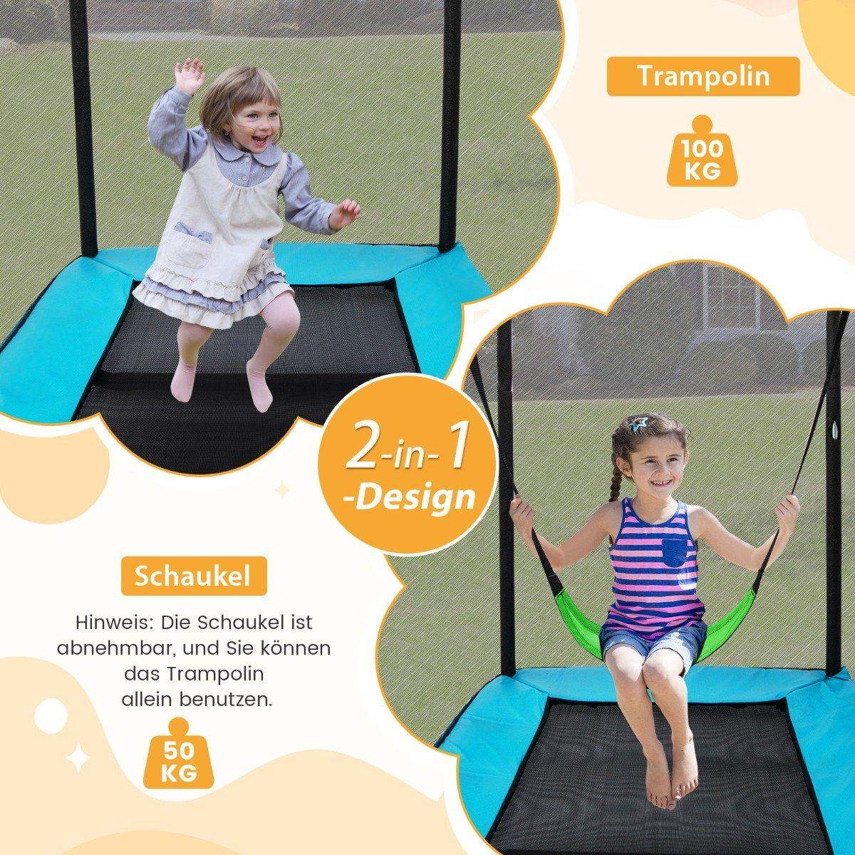 2 i 1 barnetrampolin med huske & sikkerhetsnett & kanttrekk blå + svart