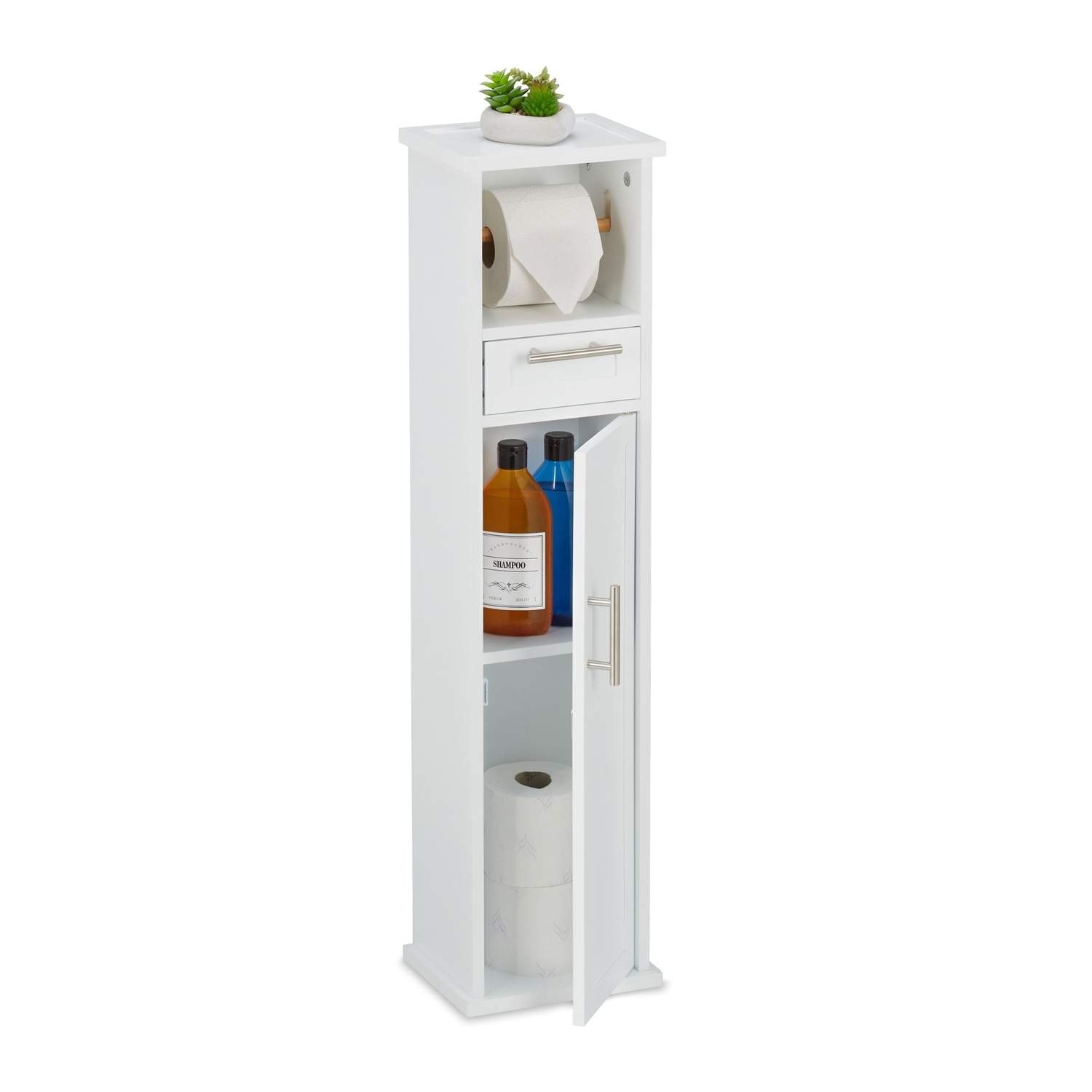 Smalt baderomsskap med bambuspapirholder