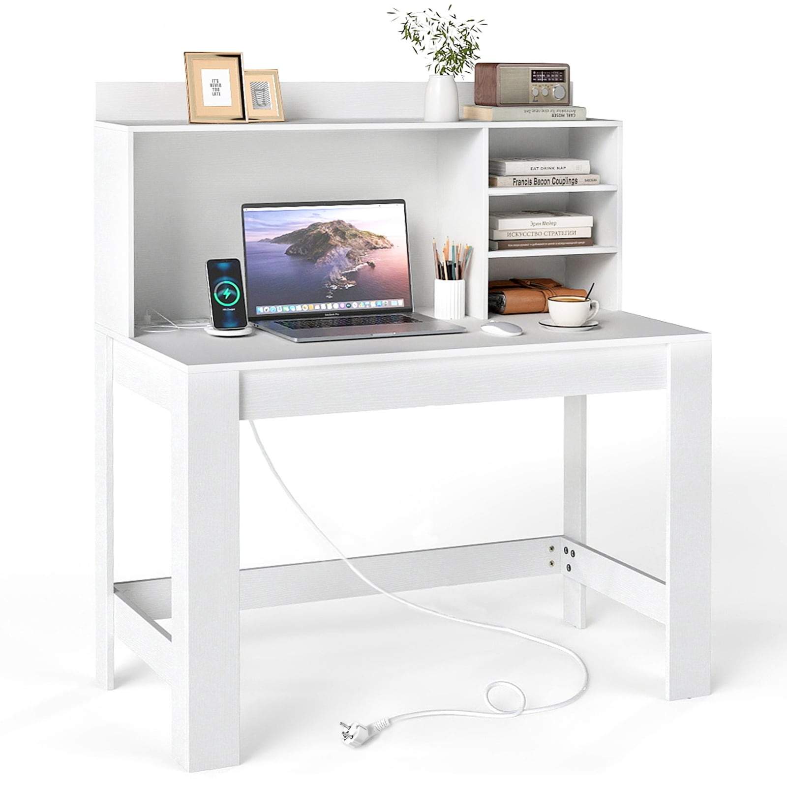 Hvitt databord med hylle – innebygd strøm og kabelhåndtering