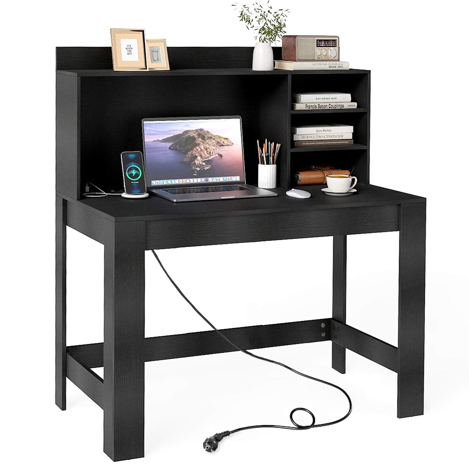 Svart databord med hylle, strømuttak og kabelhåndtering