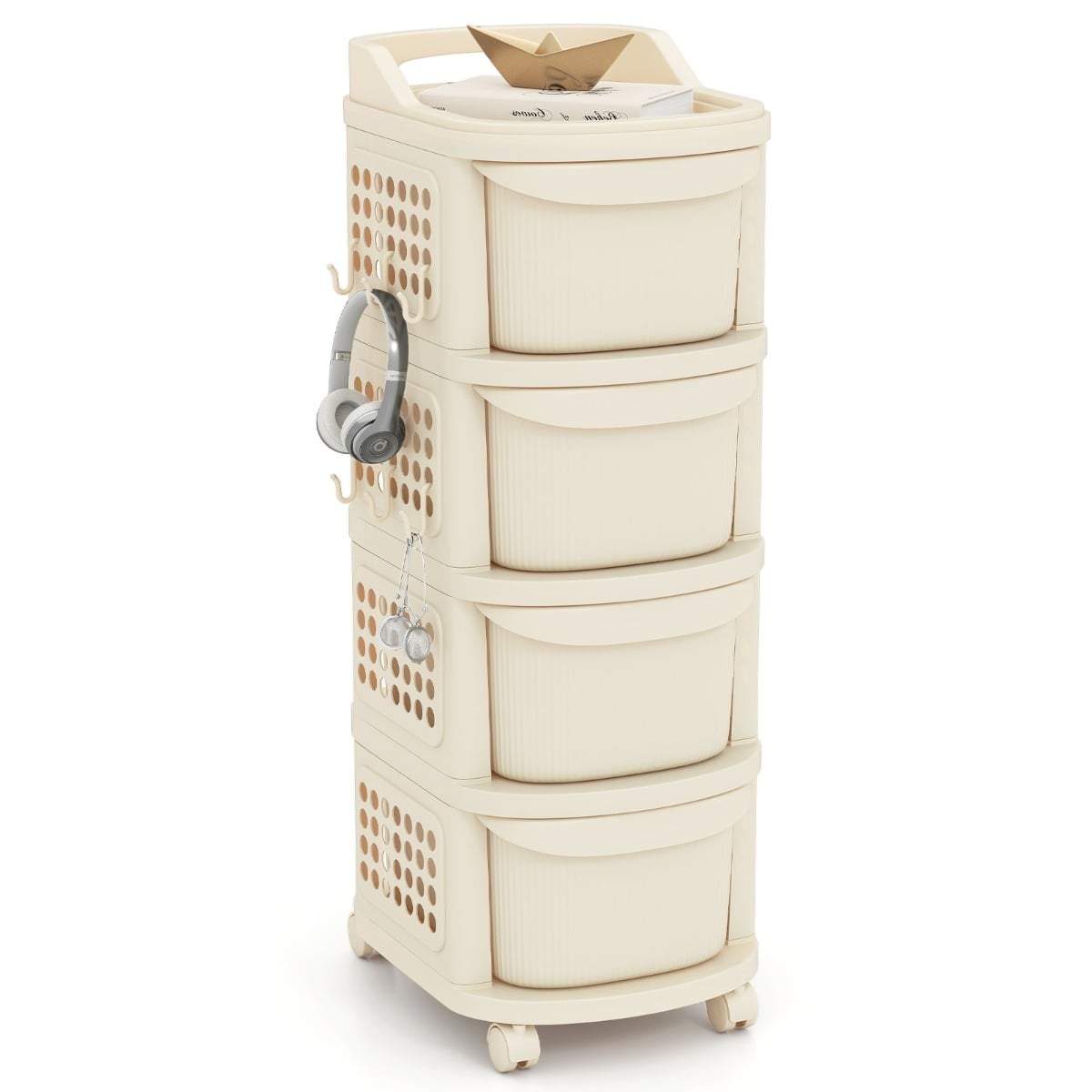 Smal rullende handlevogn – 4 skuffer, opphengsplate, kroker