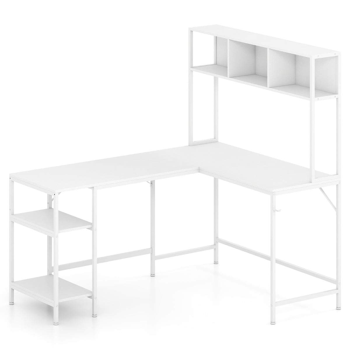 L-formet skrivebord med bokhylle – hvitt hjørnespillbord