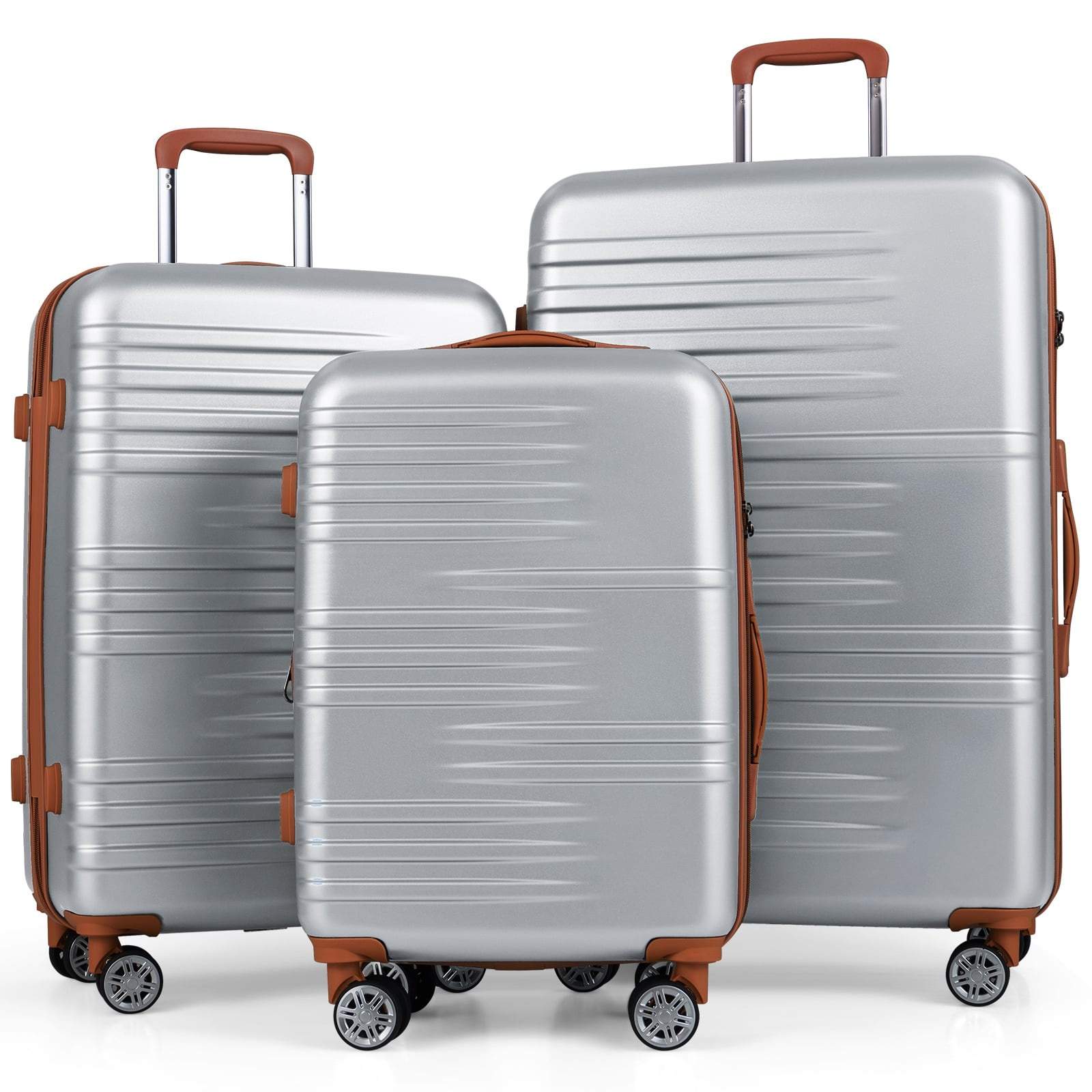 3-delt sølvfarget hardshell-bagasjesett med TSA-lås og spinnerhjul
