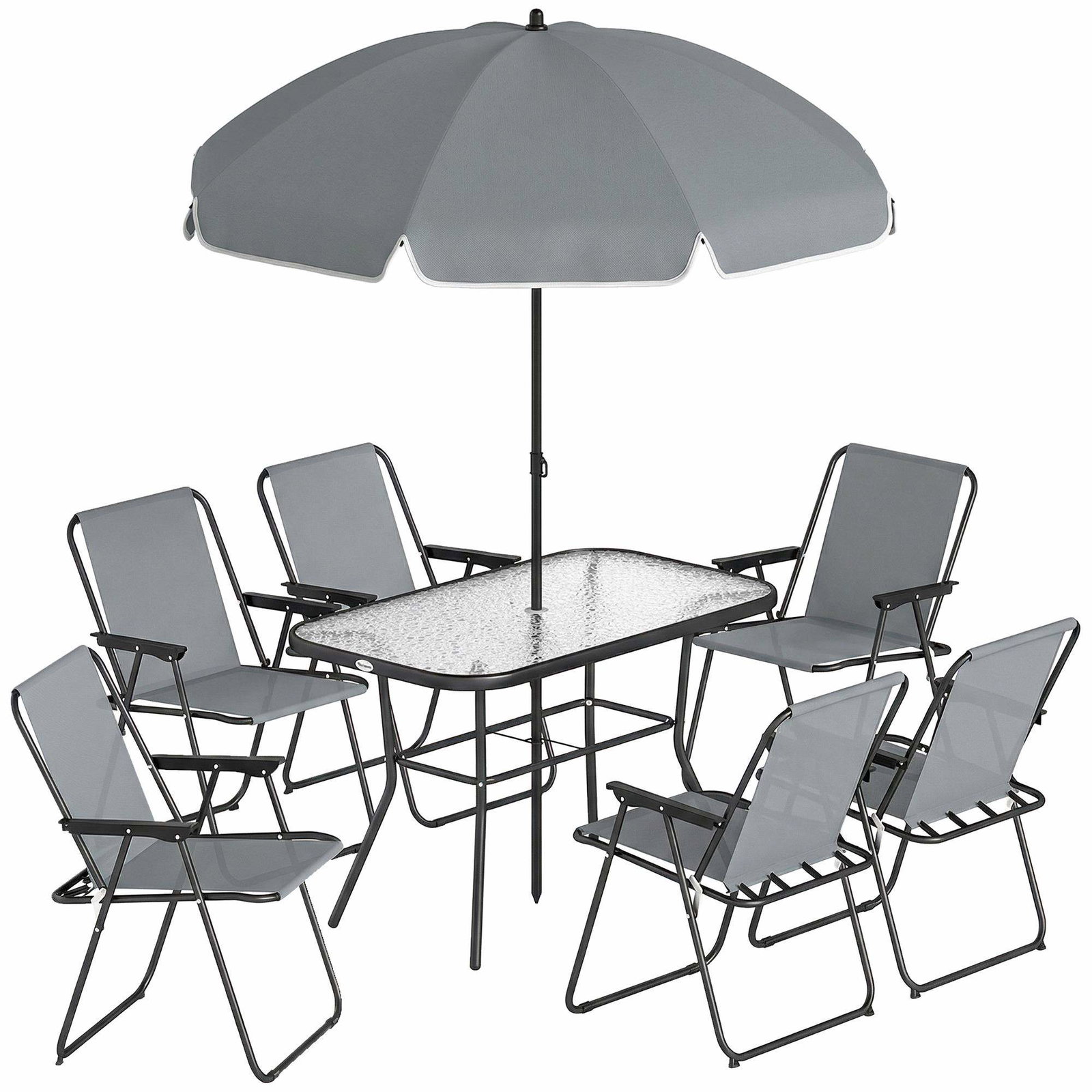 Utendørs spisegruppe – glassbord, 6 klappstoler, grå