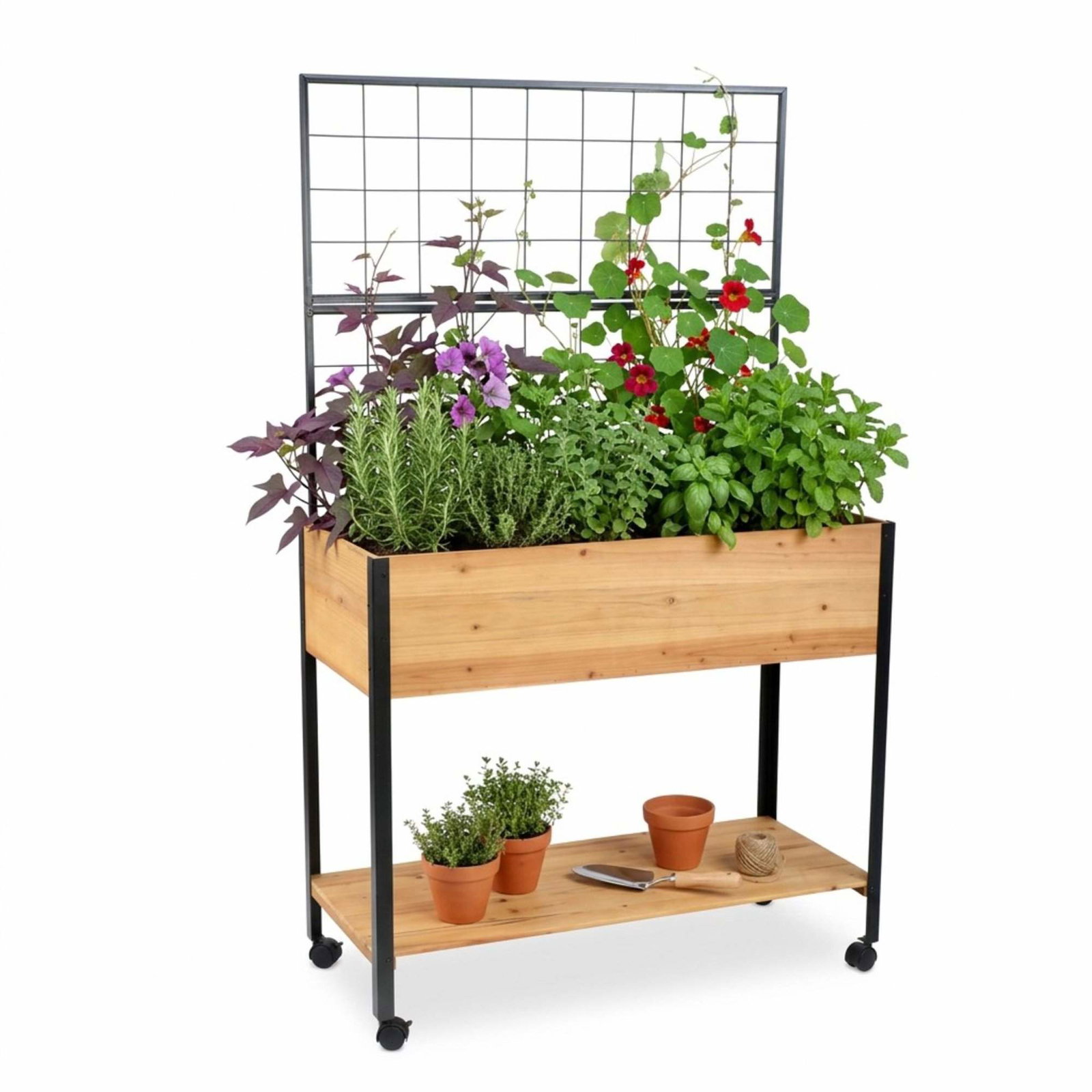 Høybed i furu og stål med espalier og hylle