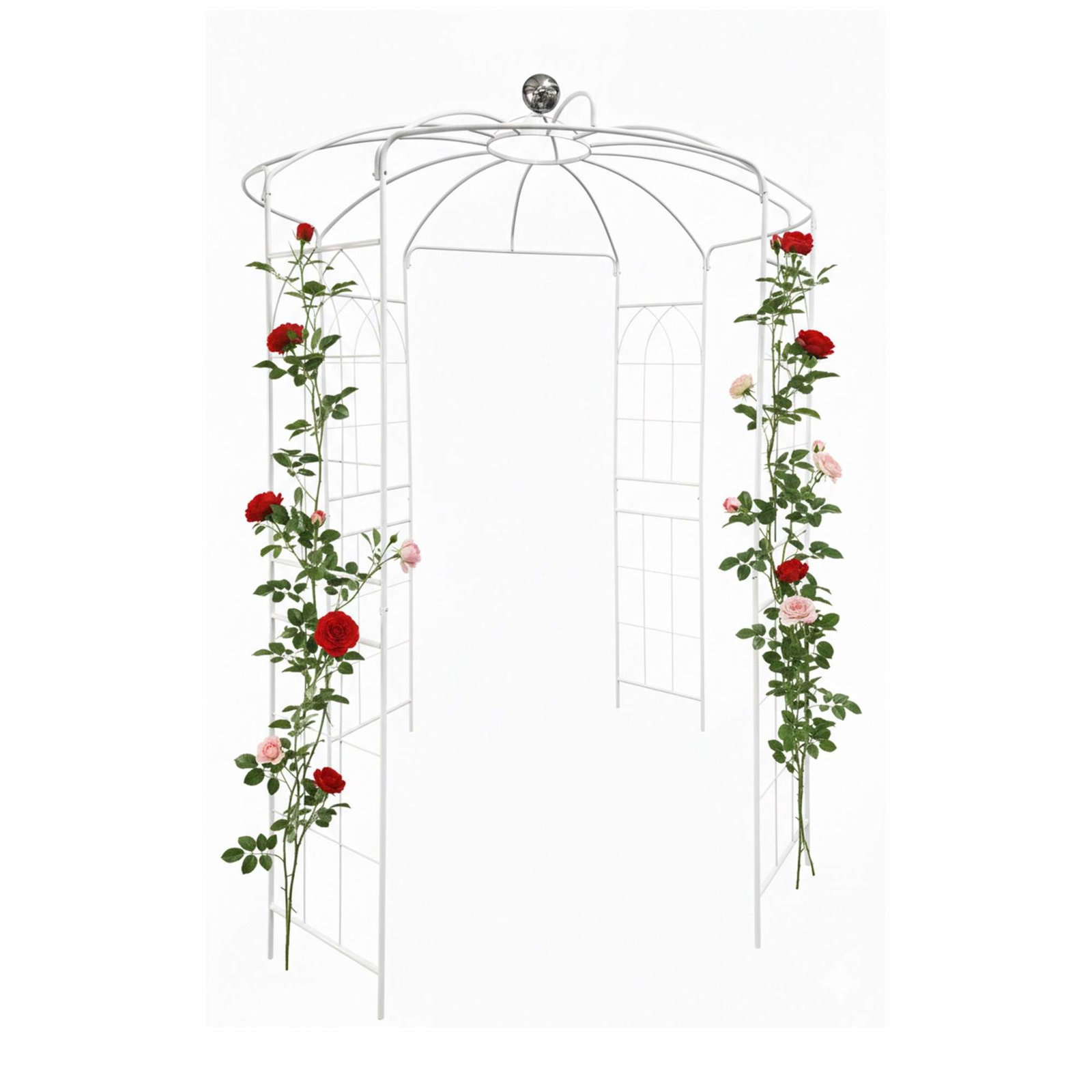 Metallhagepergola med kuppel og hengende kurvkrok