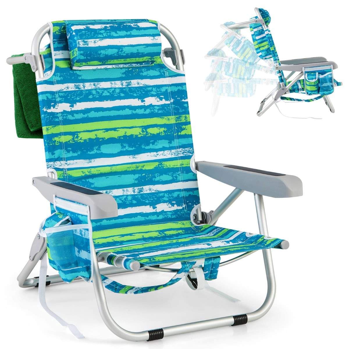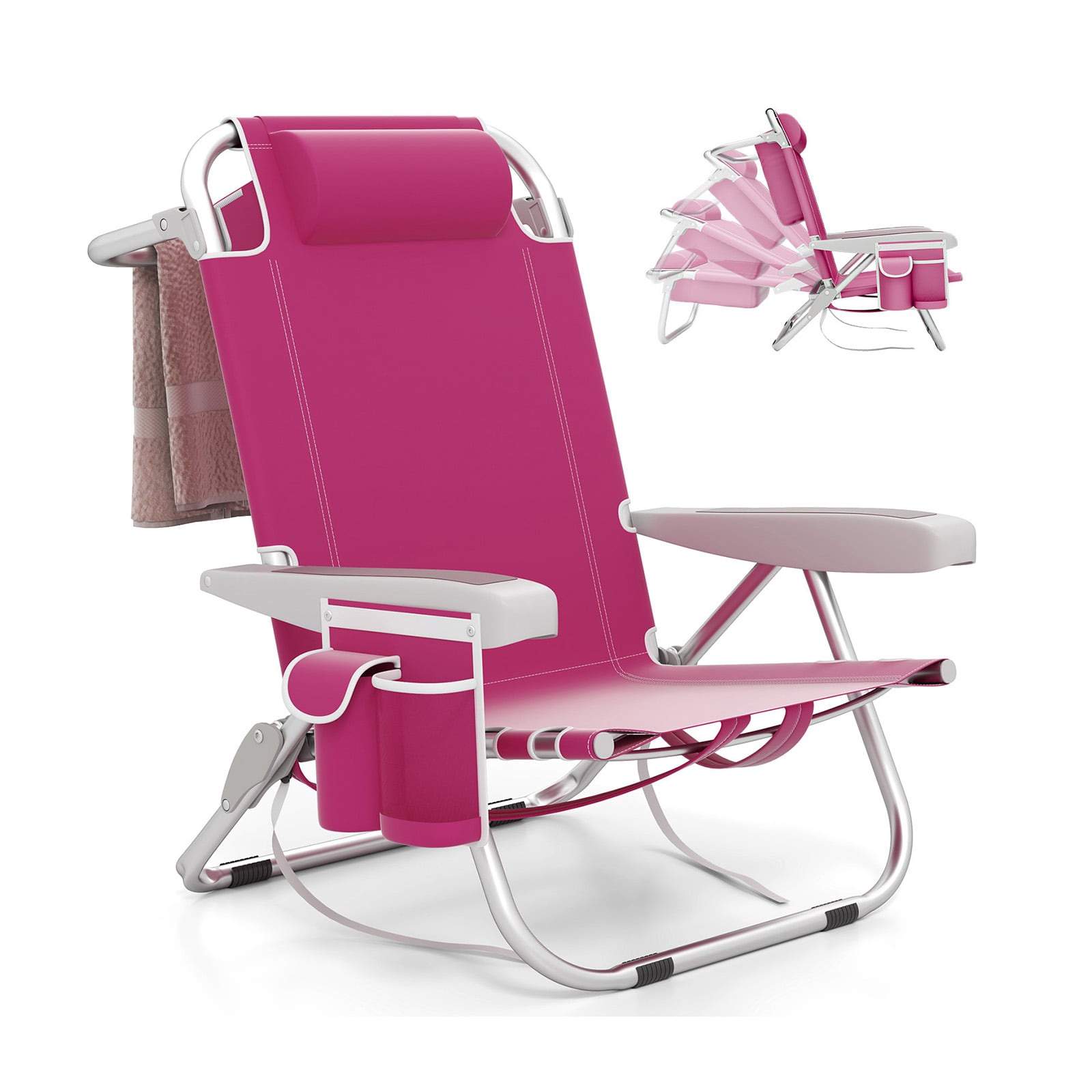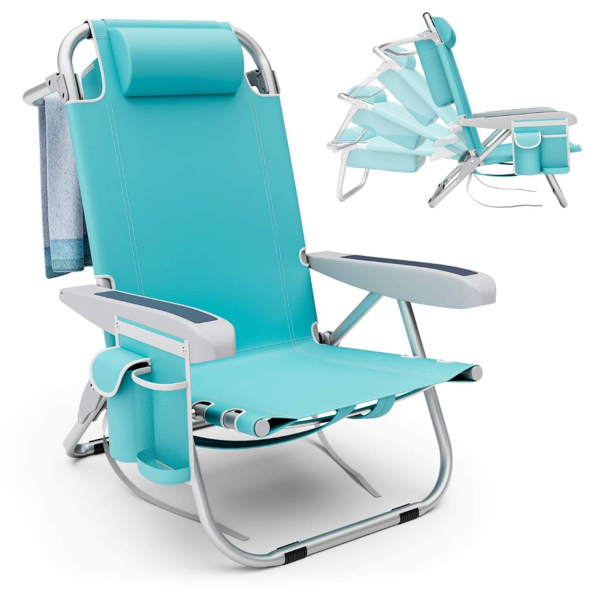 Sammenleggbar strandstol med justerbar ryggstøtte og lommer
