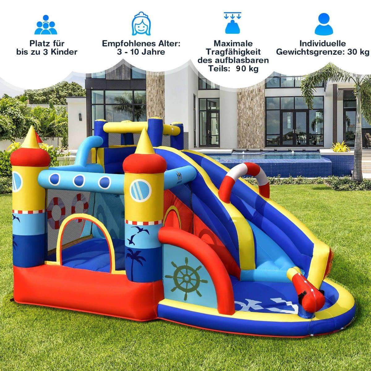 Oppblåsbart hoppehus i vannpark med sklie og kanon