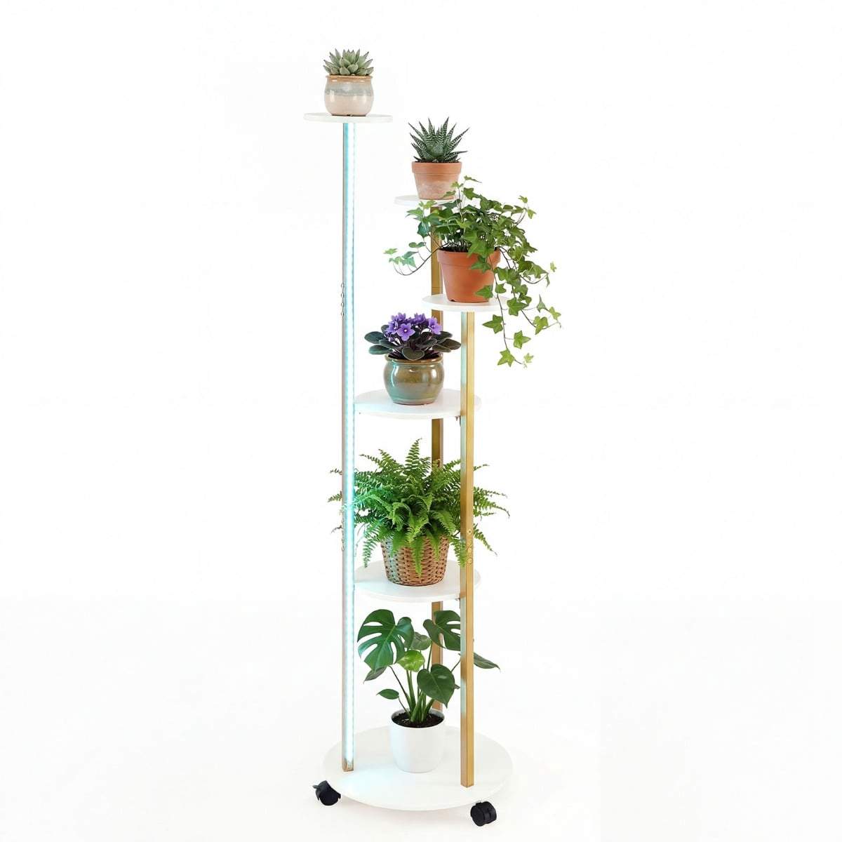 6-etasjes plantestativ med LED-lys og hjul – hvit/gull