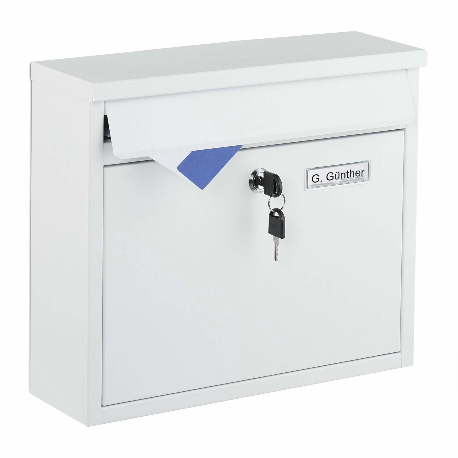 Veggmontert postkasse i jern med navneskilt og nøkler