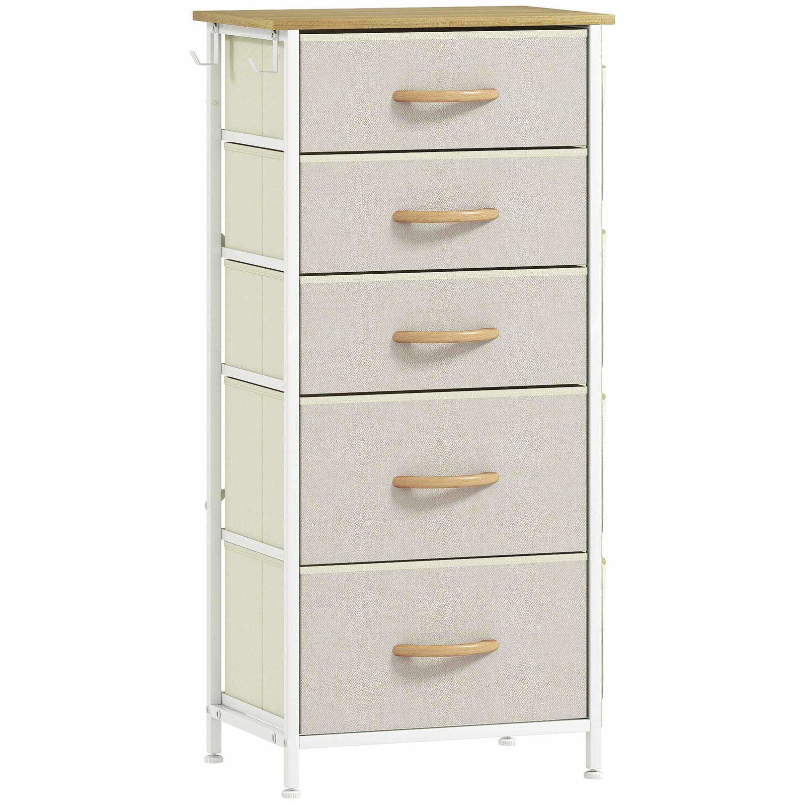 Stoffkommode med 5 skuffer, stålramme og kroker