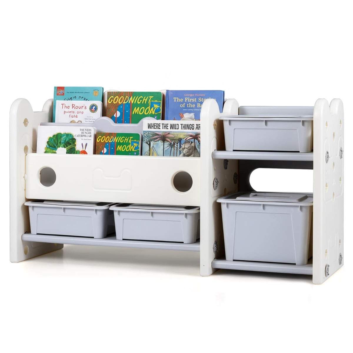 Barn 2-i-1 bokhylle og leketøysorganisator med oppbevaringsbokser