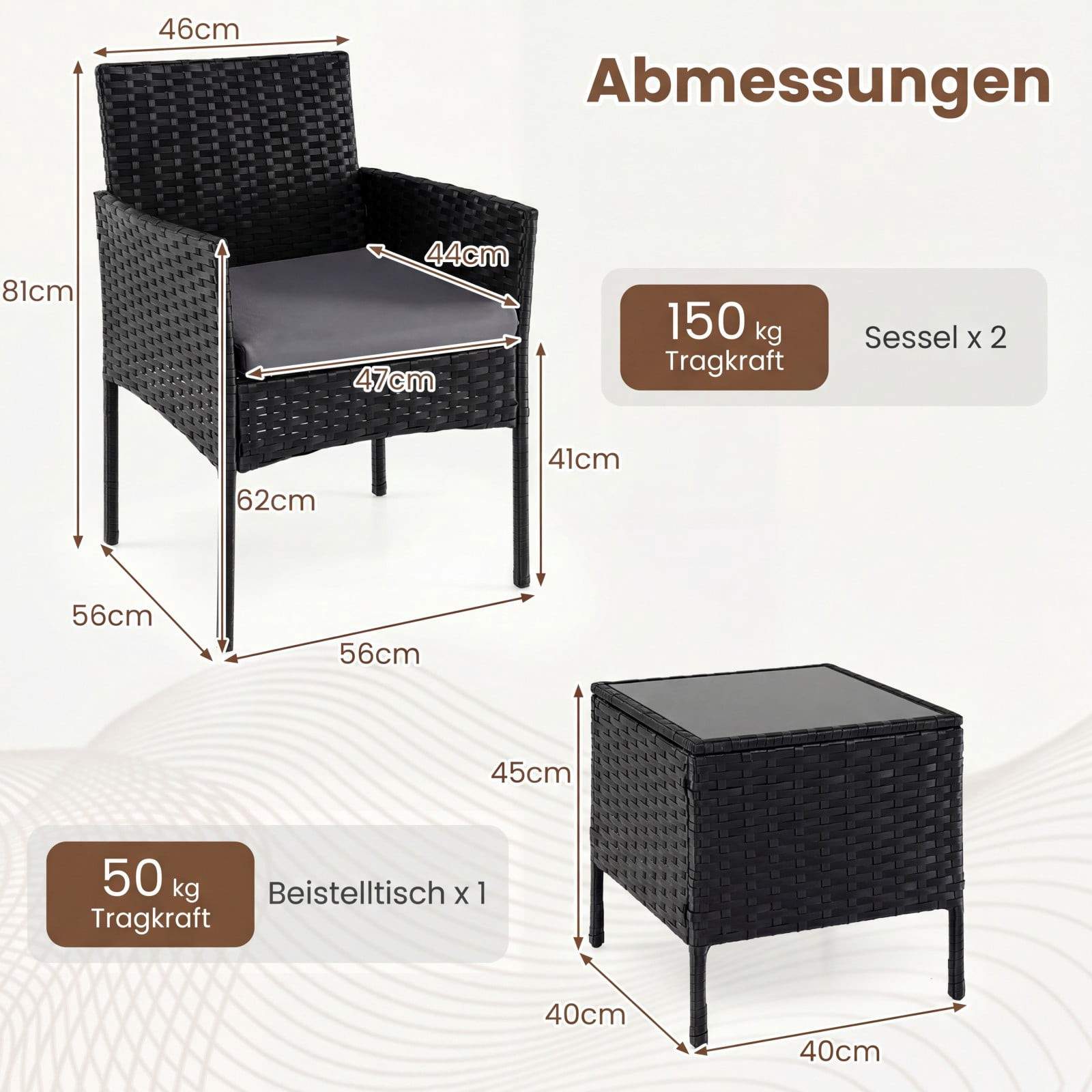 3-delt rotting terrassesett – stoler og glassbord, svart