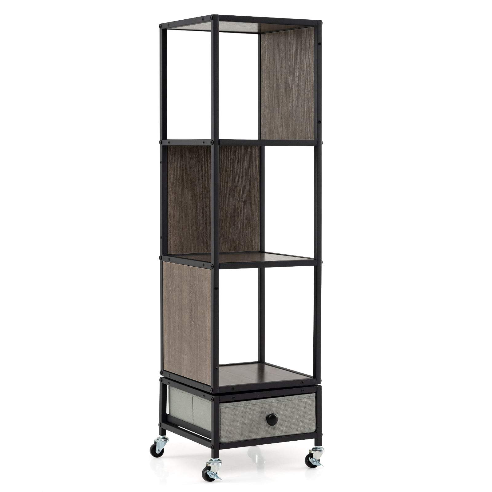 4-etasjes roterende bokhylle med skuff – grå, mobil og plassbesparende