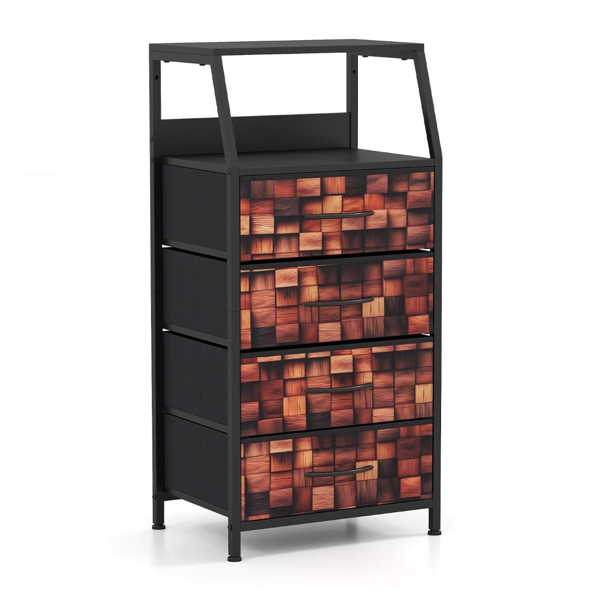 Industrielt nattbord med 4 stoffskuffer og åpen hylle