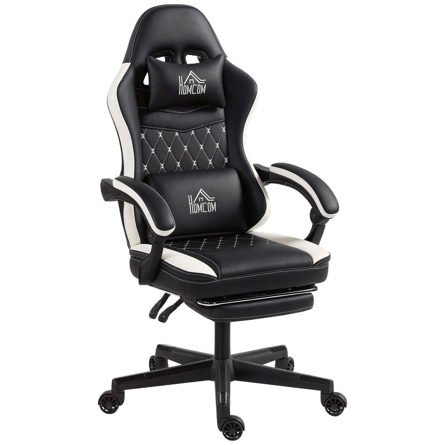 Spillstol med fotstøtte, nakkestøtte og pute, svart/hvit