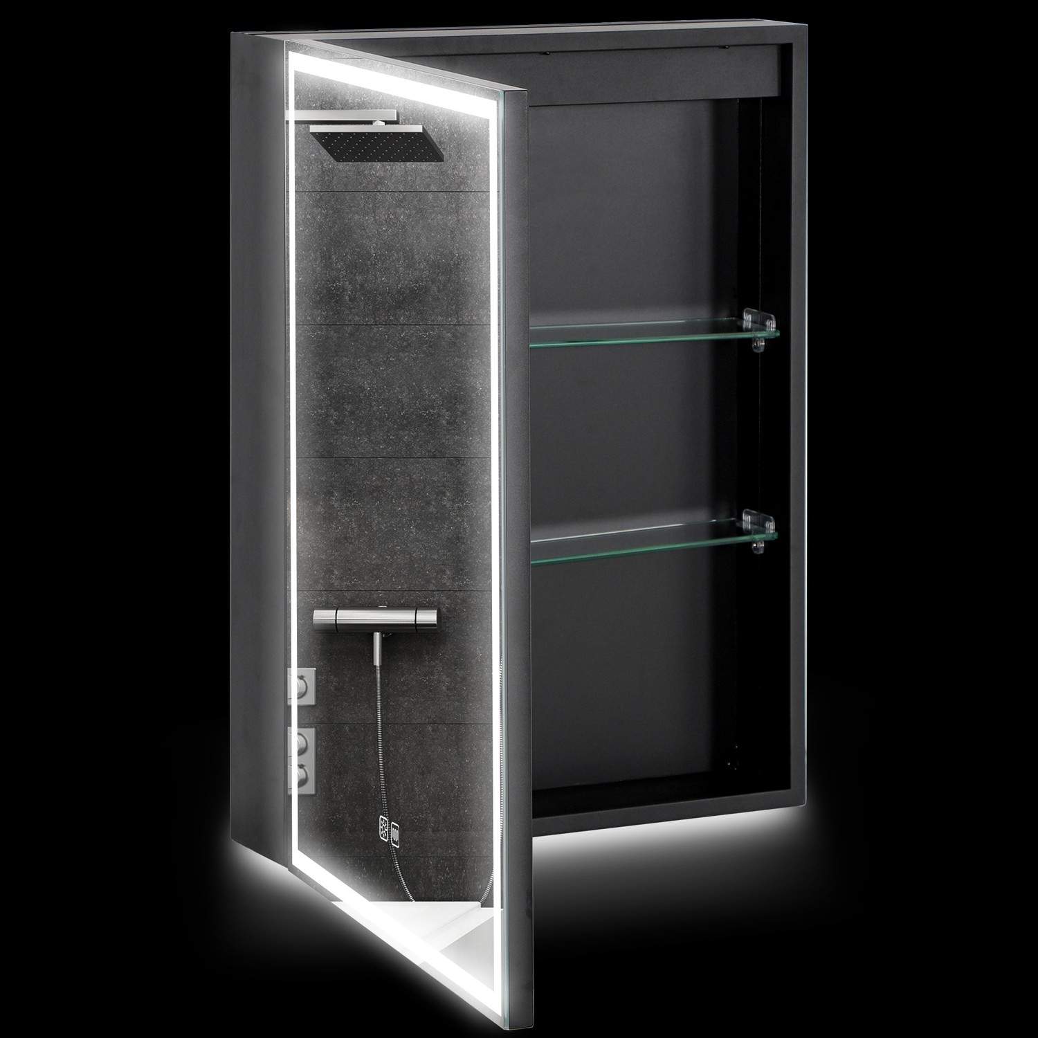 Speilskap bad, baderomsskap med LED-belysning, antidugg, overskap med 3 lysfarger, minnefunksjon for bad, sort, 50 x 12,8 x 70 c
