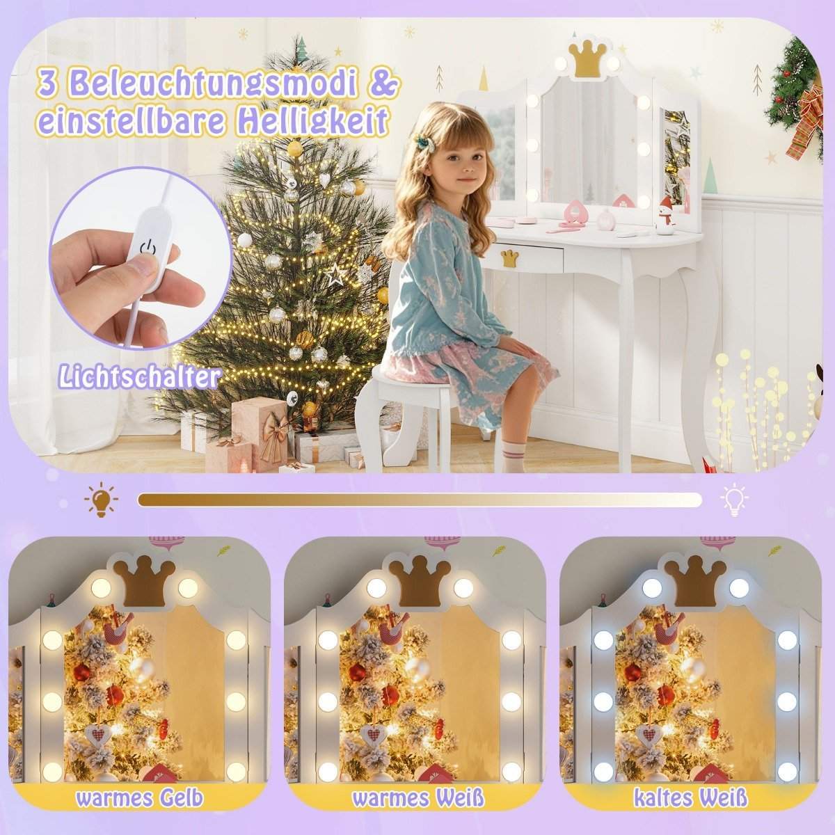 Sminkebord for barn med belysning, sminkebord for jenter med trefoldbart speil, hvit