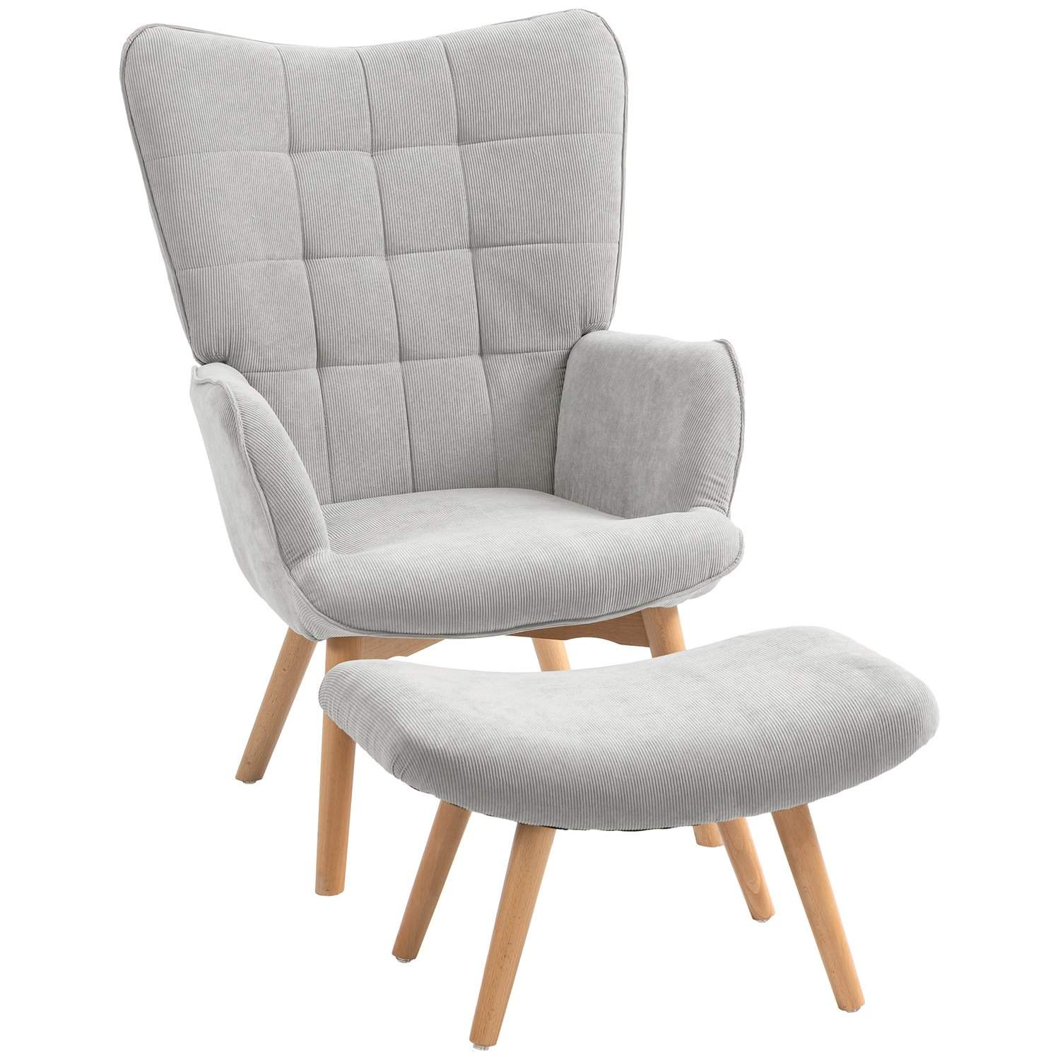 Vingestol med krakk, avslapningsstol, polstret stol i kordfløyellook, lenestol, lenestol med treben, TV-stol til stue, grå