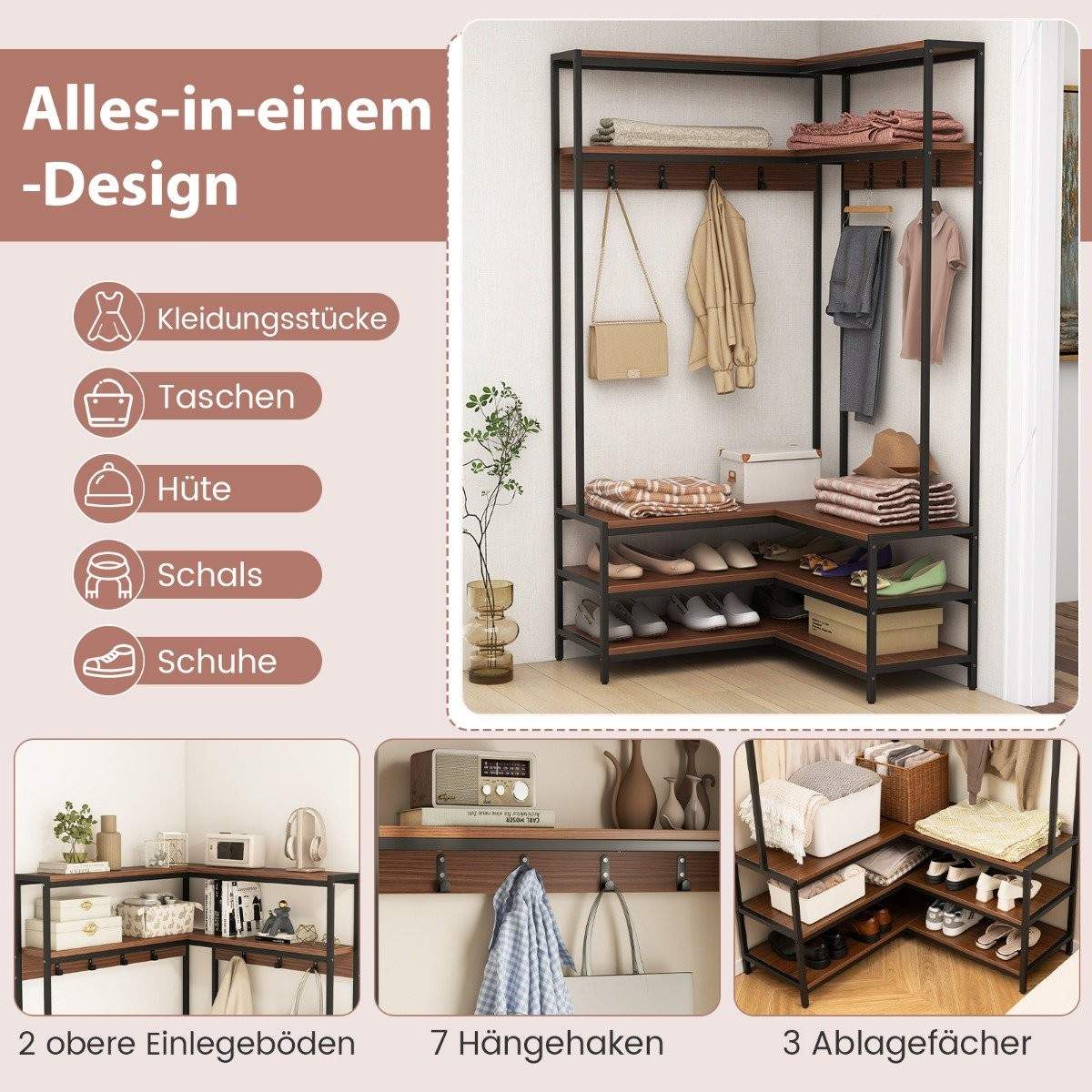 Hjørneklesstativ med benk L-formet klesstativ med åpne hyller 90 x 90 x 178 cm valnøtt