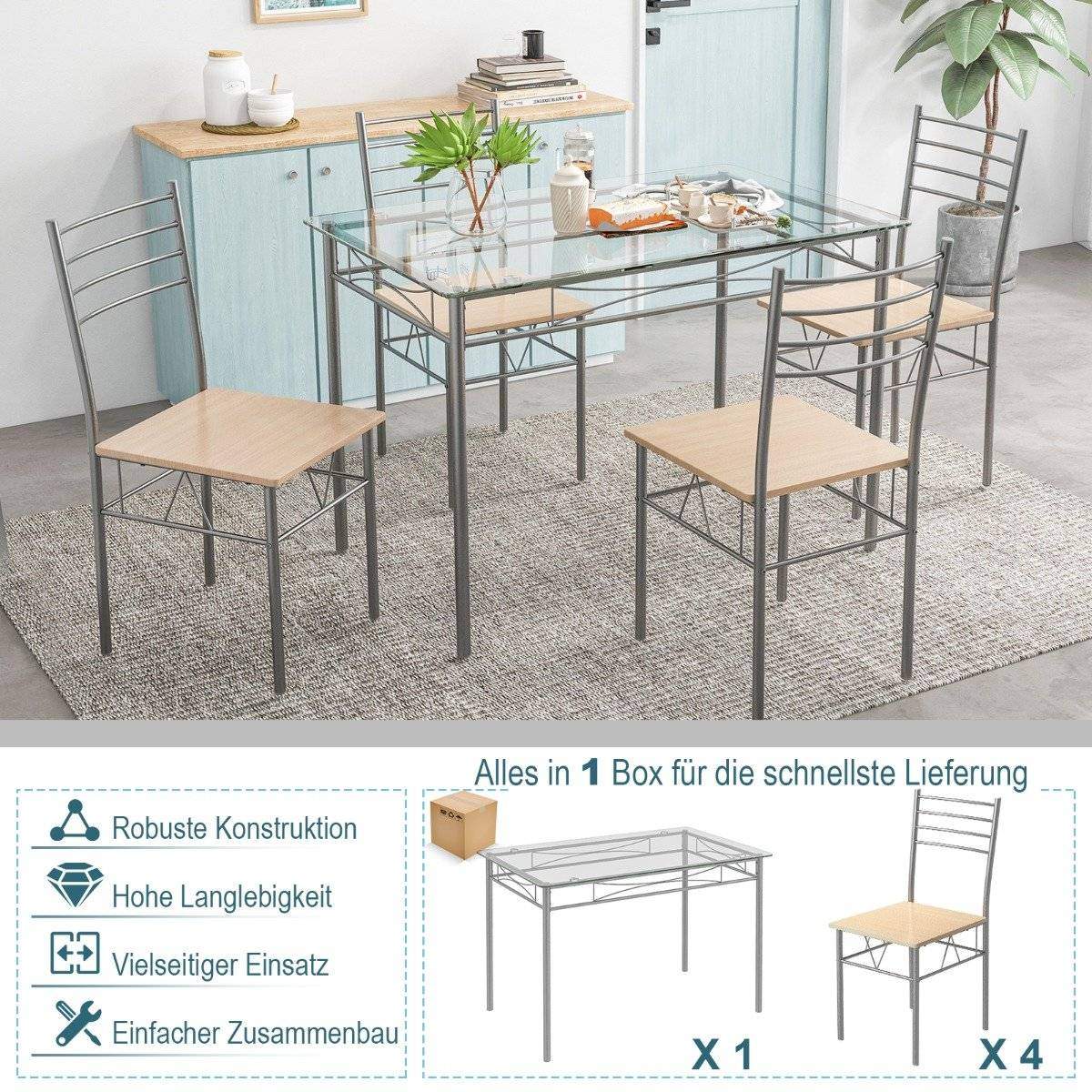 5-delers spisestuesett rektangulært glass spisebord med 4 stoler og rustsikker metallramme