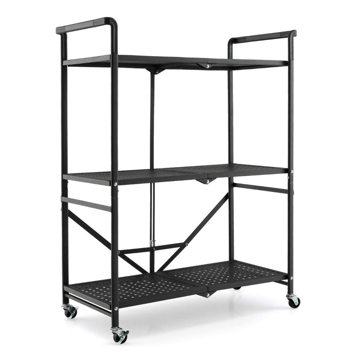 Sammenleggbar serveringsvogn med 4 hjul 3-lags metallhylle for kjøkkenkontor Svart