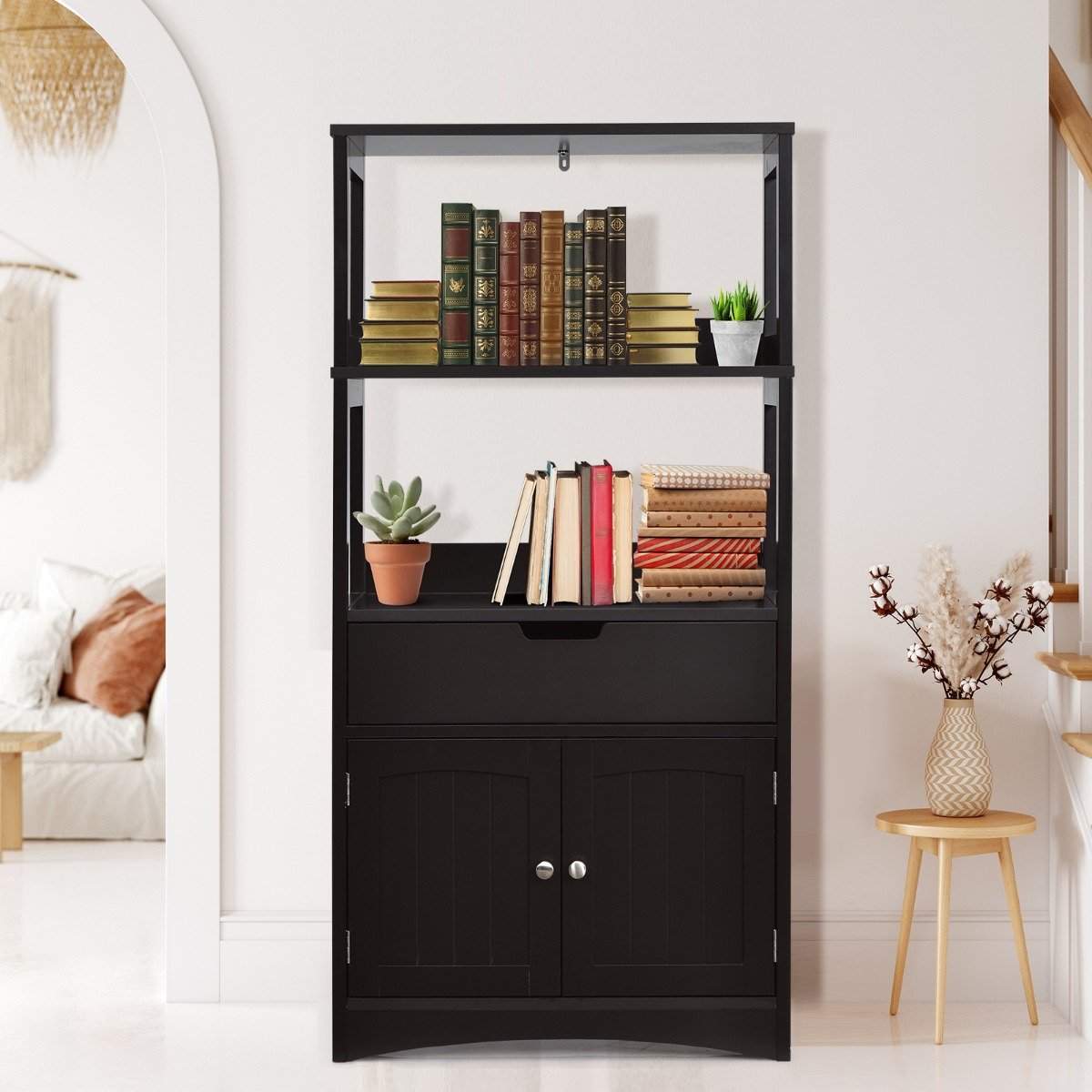 Frittstående baderomsskap med 2 dører & 3 åpne hyller & skuffe høyskap sort