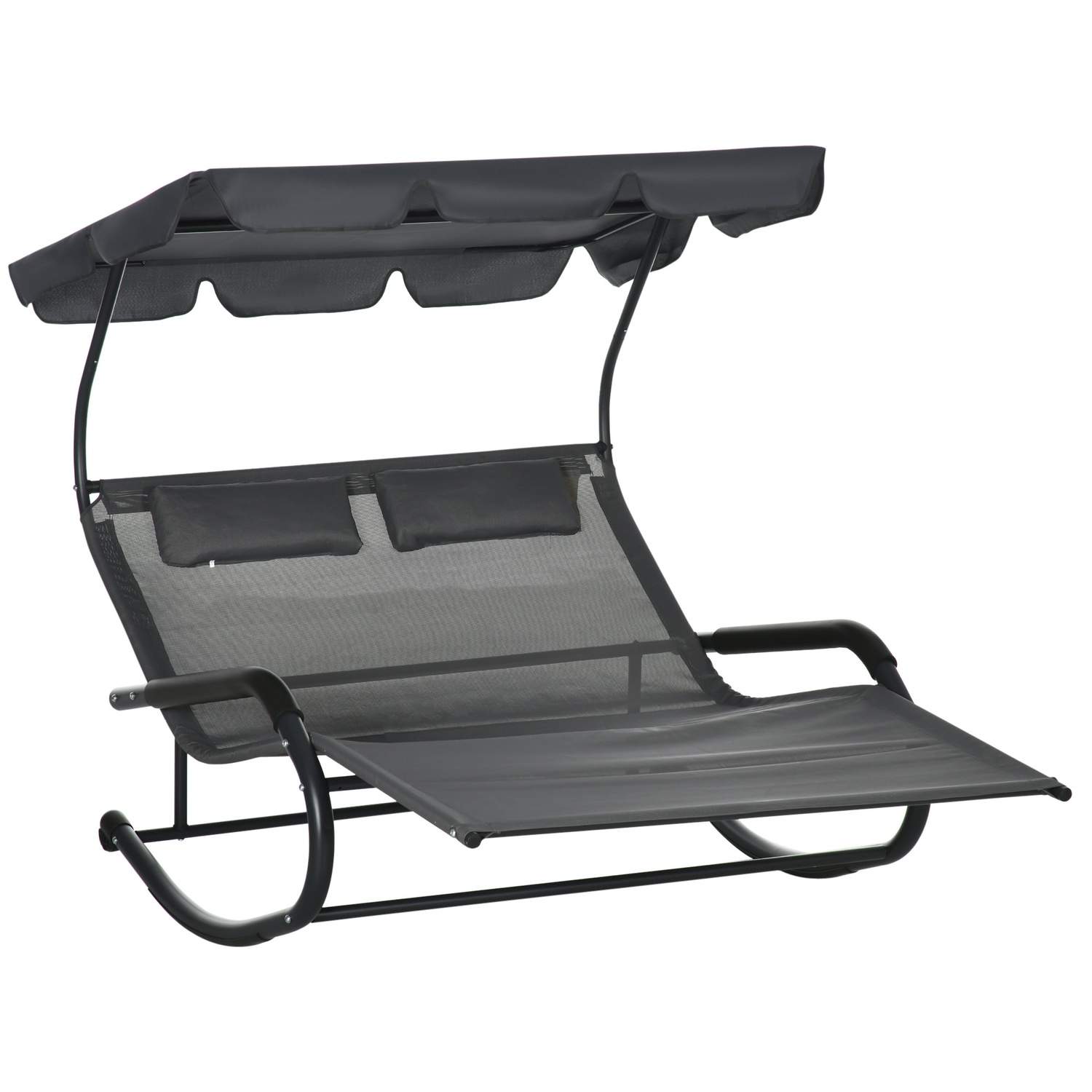 Dobbel solseng, svingbenk med solseil, gyngestol med hjul, hageseng med pute, 220 kg belastning, for 2 personer, mørkegrå, 200x1