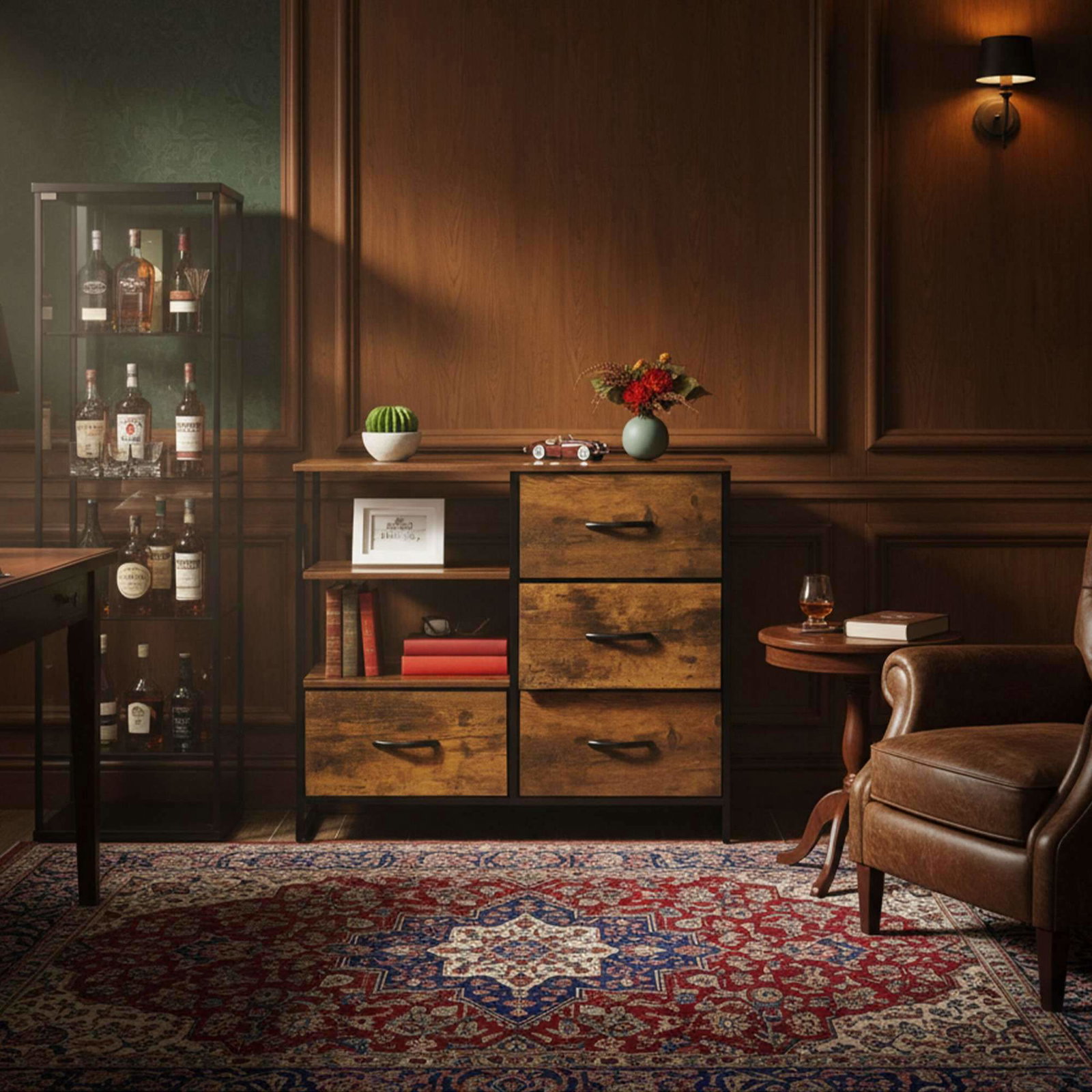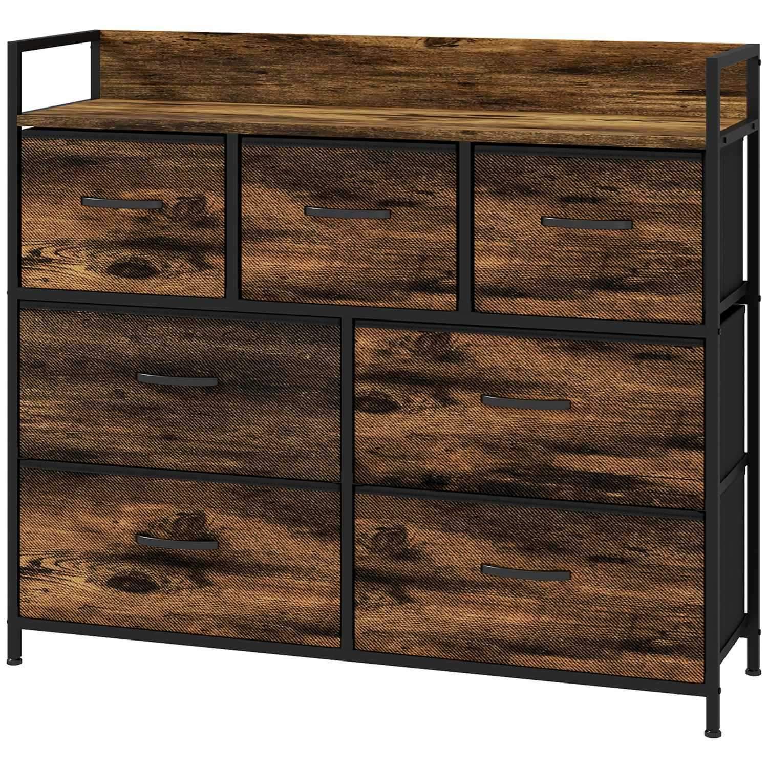 Rustikk kommode med 7 stoffskuffer og hylle