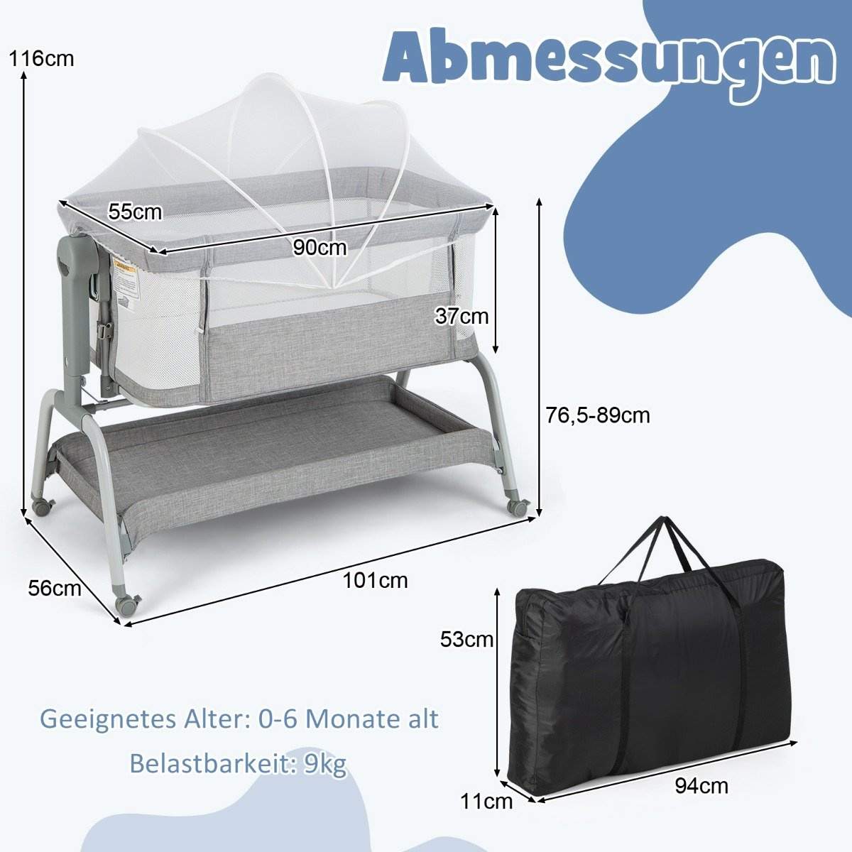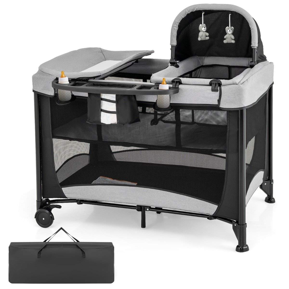 4 i 1 mobil babyseng med myggnett og madrass og 6 justerbare høyder grå