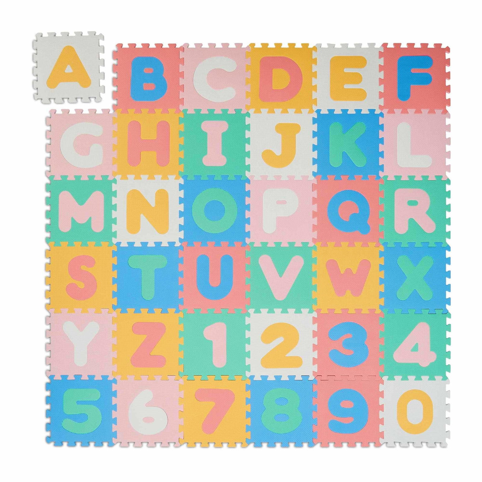Fargerik puslespillmatte med ABC og tall