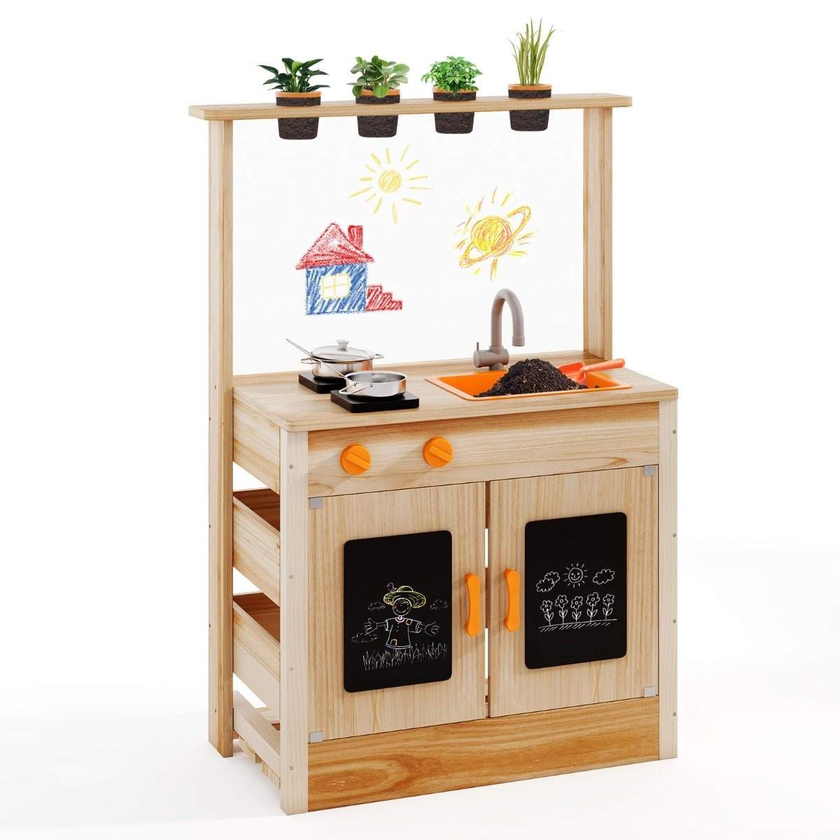 Lekekjøkken for barn med plantepotter og kokekar og komfyrer Lekesett i tre