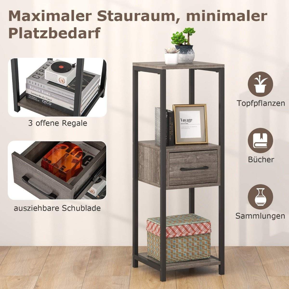 3-lags metall plantestativ Blomsterstativ med skuff 30,5 x 30,5 x 92 cm Grå (1 pakke)