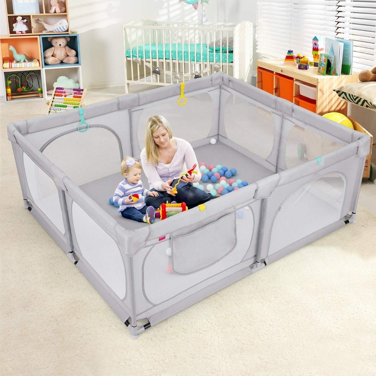 Babylekegrind med 4 trekkringer og 50 havballer og pustende netting- og bæreveske lysegrå