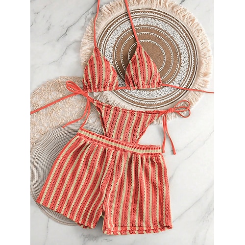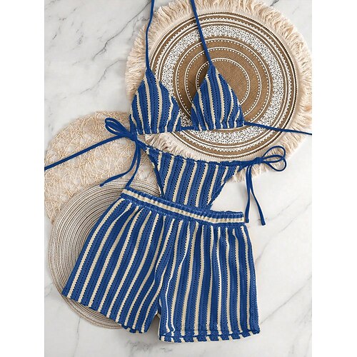 Bikini da donna 2 pezzi costume da bagno con perizoma slim senza schienale abbigliamento da spiaggia per le vacanze righe collare halter costumi da bagno senza maniche