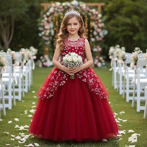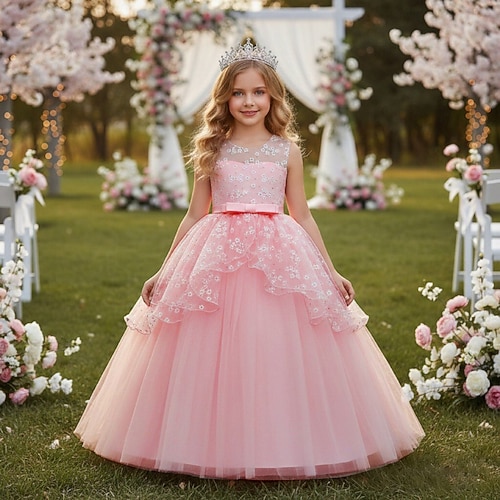 Abito da damigella d'onore bambina Ragazze Abito formale Abiti da sposa Feste Matrimonio Formale Moda Principessa Bello Patchwork Rete Floreale Senza Maniche Girocollo Champagne Rosa Dai 4 anni in su