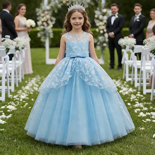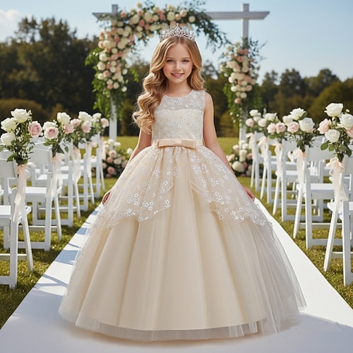 Abito da damigella d'onore bambina Ragazze Abito formale Abiti da sposa Feste Matrimonio Formale Moda Adorabile Formale Patchwork Rete Floreale Da principessa Senza Maniche Girocollo Blu Champagne