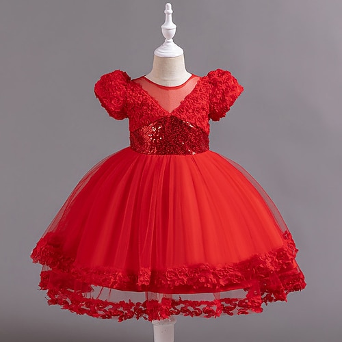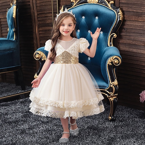 Abito da damigella d'onore bambina Ragazze Abito formale Abiti da sposa Feste Matrimonio Formale Adorabile Principessa Bello Patchwork Rete Tinta unica Maniche Corte Girocollo Champagne Rosa Dai 4