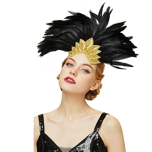 Accessori Samba del Carnevale di Rio Fascia per Capelli con Piume da Flapper degli Anni '20 - Copricapo da Showgirl in Paillettes Nero e Oro - Accessorio per Costume del Grande Gatsby Costume per