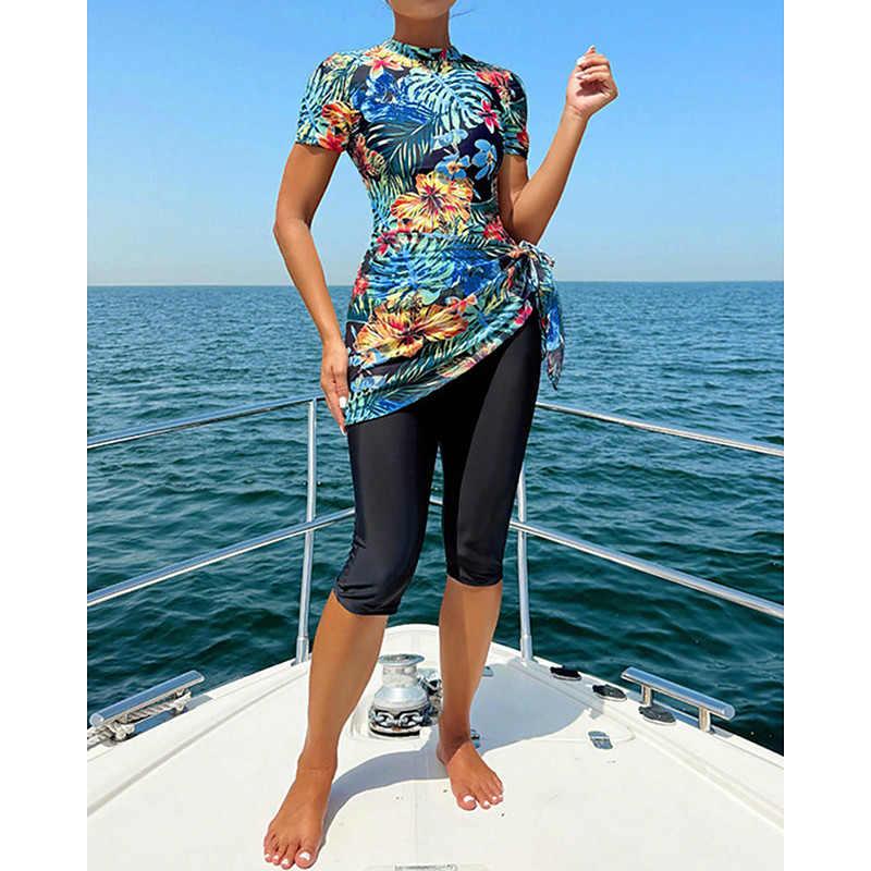 Women's Floral Print Swimsuit Bathing Suit 2 Pieces Printed Ultra Light (UL) UV Protection Elastic Short Sleeve Swimwear Surfing Snorkeling Summer