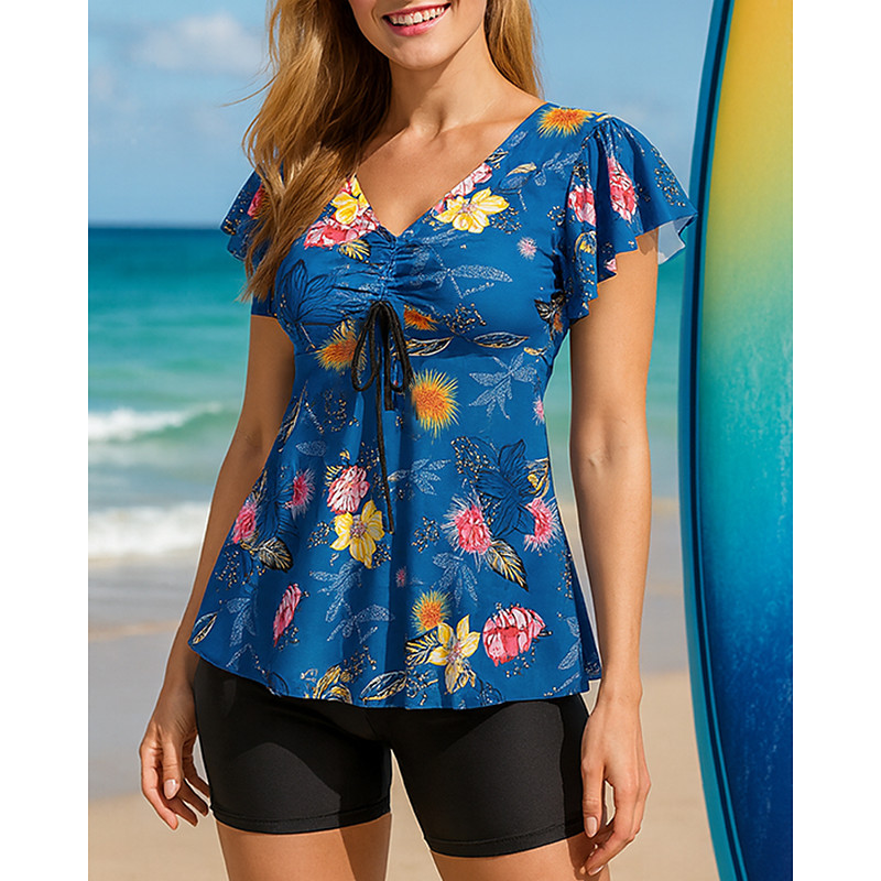 Women's Bathing Suit 2 Pieces Swimsuits Printed UV Protection Elastic Short Sleeve Swimwear V Neck Flared Sleeve Surfing Beach Swimming Summer