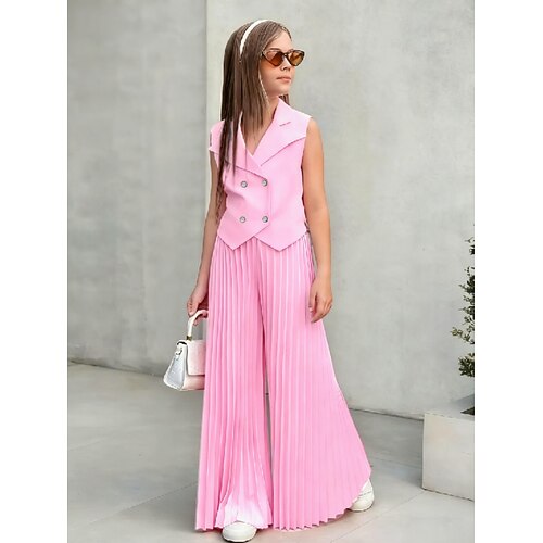 2 Stück Kinder Mädchen Einfarbig Gerafft Hemd Hose einstellen Ärmellos Mode Lässig Ab 4 Jahren Sommer Dunkelrosa Weiß Rosa
