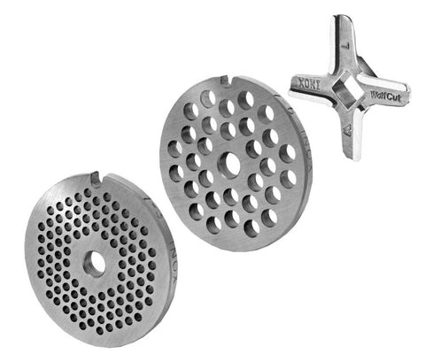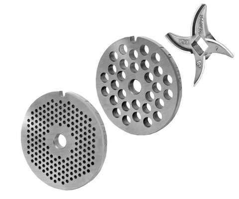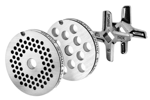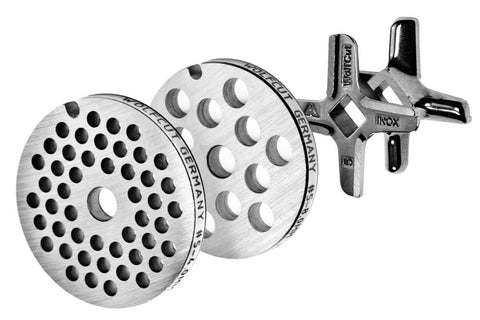 WOLFCUT Fleischwolfscheibensatz 2 mm + 6 mm Bohrung und ein Sichelmesser kompatibel mit allen gängigen Fleischwolf Marken Größe 7