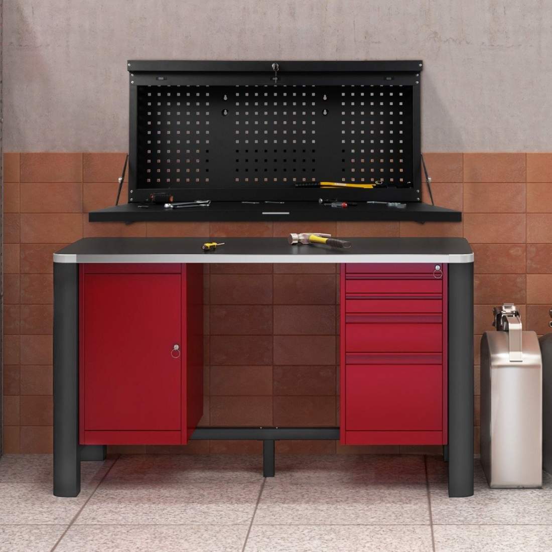 Veggmontert sammenleggbar arbeidsbenk med perforert vegghengende arbeidsbord Svart