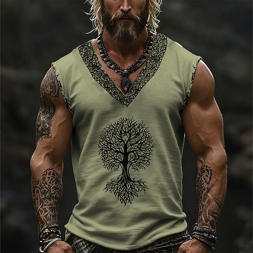 Herren T Shirt T-Shirt Kurzarmshirt Kurzarm V Ausschnitt Sommer Wikinger Baum des Lebens Yggdrasil Vintage Designer Ethno-Stil Druck Urlaub Straße Ausgehen Aprikose Khaki Top T-Shirt für Herren