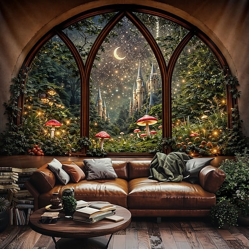 Arazzo da finestra con castello fantasy raffigurante una scena magica nel bosco, grande murale da favola con luna per camera da letto, dormitorio e decorazione murale del soggiorno