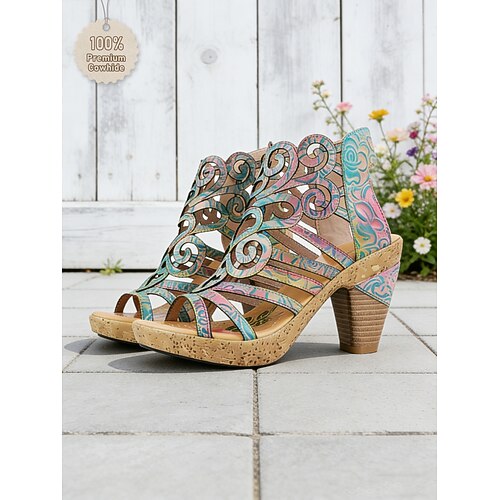 sandali da donna in pelle di vacchetta colorata con tacco a blocco tagliato al laser e nastro magico, stile gladiatore bohémien per feste in giardino, festival e occasioni speciali